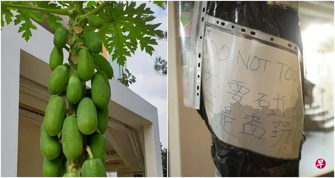 家住蔡厝港弯第673座组屋的彭先生(40来岁,自雇人士)近日在面簿发文指,自己种在住家外草坪的木瓜树屡屡遭贼光顾,安装电眼后拍下窃贼摘瓜的过程。