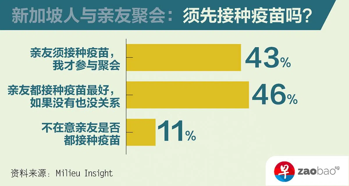 在新加坡,坚持亲友先接种疫苗才肯参加聚会的人占43%,是六个东南亚国家中最低的,变相反映出国人对新加坡高疫苗接种率的信心。