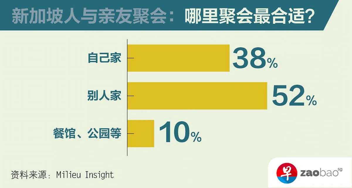 在聚会地点的选择上,九成的新加坡人希望能在家办,而非餐馆、公园等公共或户外场所。其中,超过一半希望能到亲友家做客。