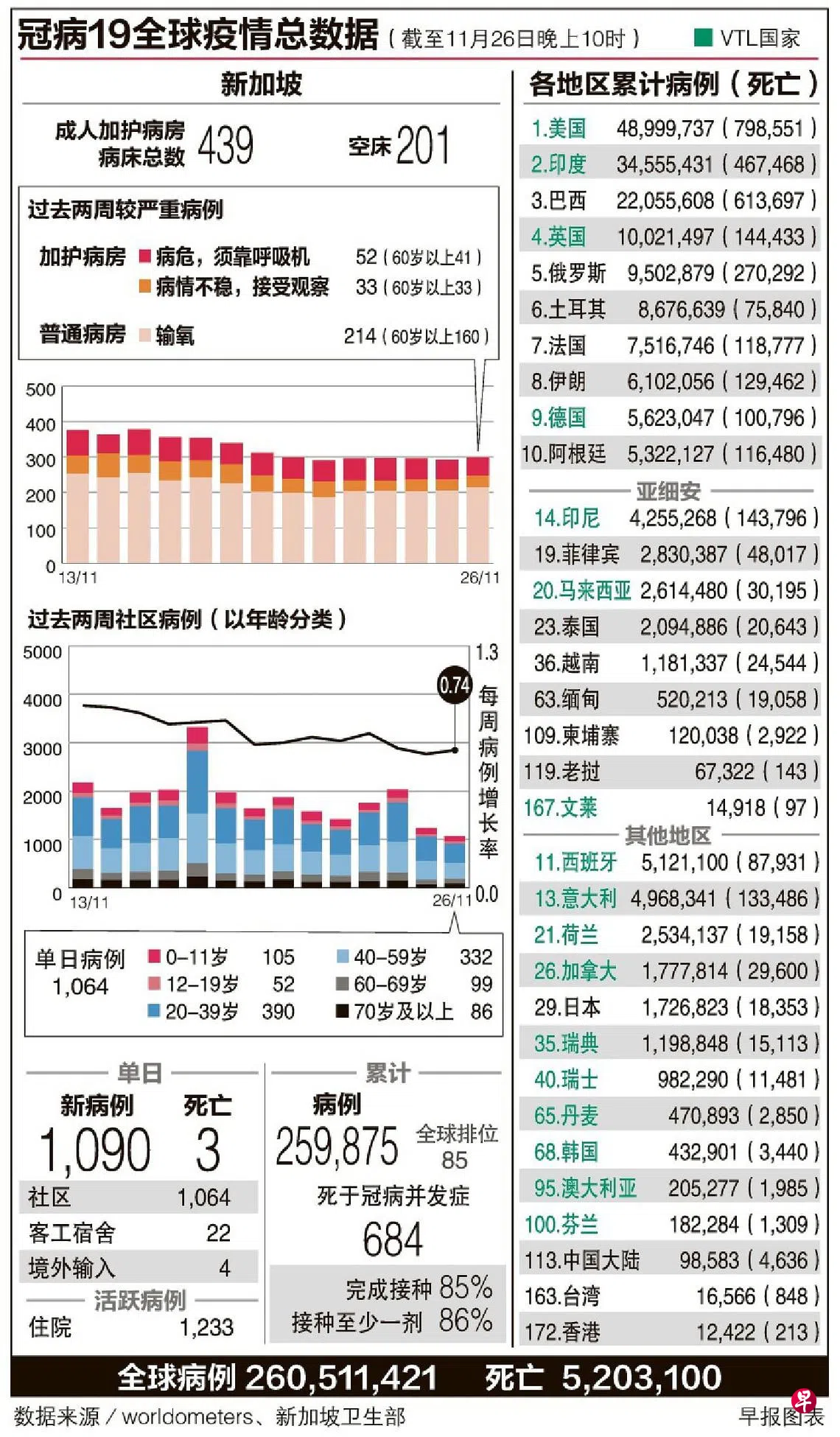 本地新增1090病例九周来最少 每周病例增长率连两周低于1订户赠阅文章魏瑜嶙 报道elynh@sph.com.sg本地昨天(11月26日)的每周社区病例增长率为0.74,连续两个星期低于1,意味着社区病例增幅趋缓。新增病例1090起,是过去九周来单日最少。死亡病例新增病例保健卫生部上一篇李显龙总理:亚欧可促进知识共享 恢复供应链运作重启跨境旅游下一篇参与国家增至27个 我国与泰国土耳其等下月开通旅游走廊购买此文章