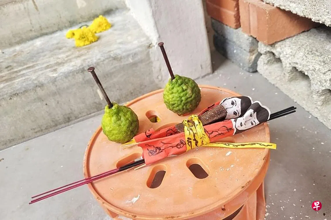 摆小棺水果插钉 夫妇被指走廊“设坛”诅咒邻居订户赠阅文章邻居被指在单位前“设坛”摆小棺木和纸扎男女,并称是宗教仪式。(徐颖荃摄)邻居走廊“设坛”,水果插铁钉、摆小棺木和纸扎男女,阿嫂控诉被诅咒。邻居称:只是宗教仪式。这罕见一幕出现在宏茂桥3道第571座组屋,其中一户人家在门口前放置一张小凳子,凳上摆着小棺木以及一对纸扎男女,旁边的水果还被插上了铁钉,吓坏隔壁阿嫂一家,上网贴文控诉被“诅咒”。记者今早(11月27日)走访,涉事单位门口还设有香坛和花等祭拜物。邻里纠纷宏茂桥陈军荣上一篇走进脑库新加坡下一篇新柔陆路VTL开通 有人网上急抛售机票