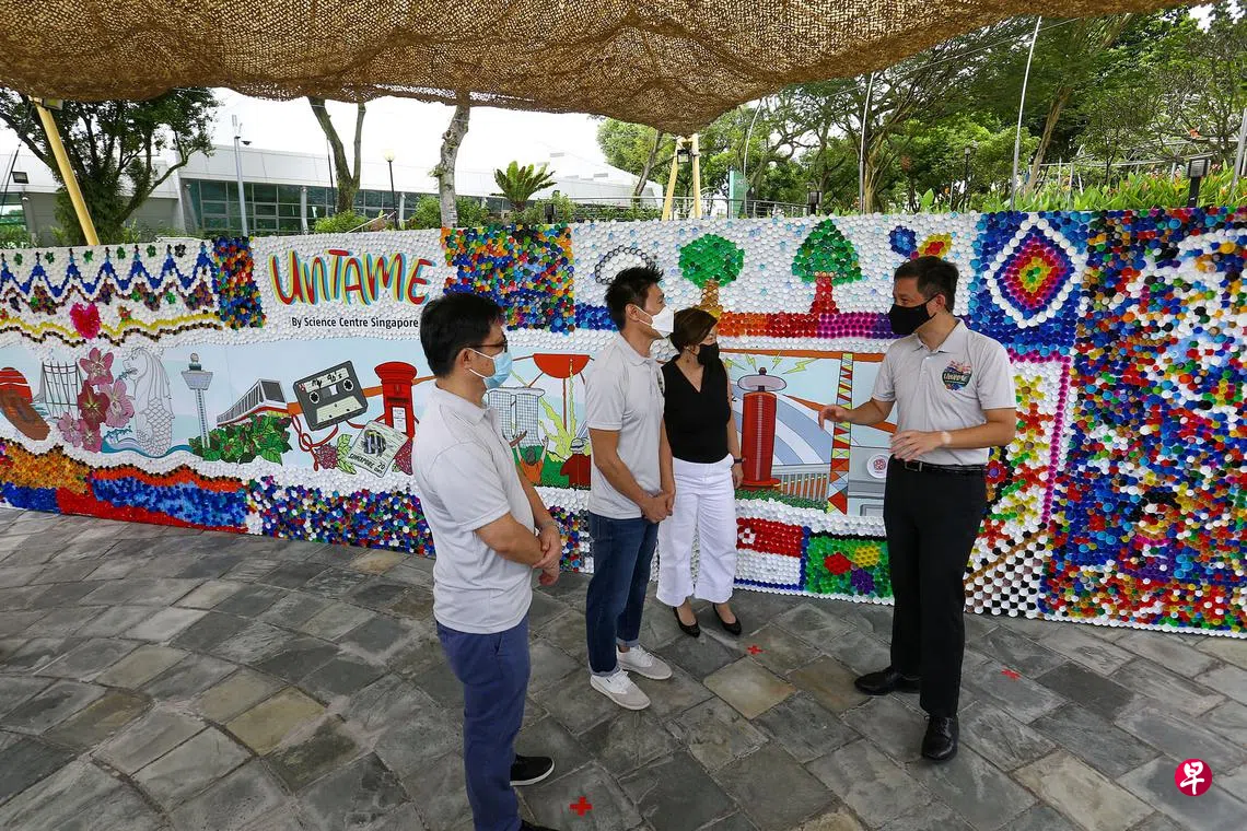 到科学馆同乐 亲子携手将塑料瓶盖砌成最长壁画订户赠阅文章新加坡科学馆呈献的本地最大幅瓶盖壁画完成,馆长林直明副教授(左起)、参与筹划的本地艺人陈之财、科学馆主席陈燕燕,以及教育部长陈振声在壁画前交流。(白艳琳摄)张艺馨 报道zyixin@sph.com.sg鱼尾狮、胡姬花、樟宜机场、滨海湾金沙……一幅高2米、宽14米的瓶盖壁画,成为我国最大、利用塑料瓶盖制成的壁画。新加坡环保陈振声面簿科技教育孩子国家公园局陈之财国家图书馆家长新加坡华族文化中心可持续发展孩童塑料设计科学人才学校假期亲子本地艺人科学家气候环境活动上一篇收益捐赠环保组织 零售商收费后塑料袋用量月减六成下一篇青年躲避临检弃车逃逸 车内发现漏税烟警方正追捕购买此文章