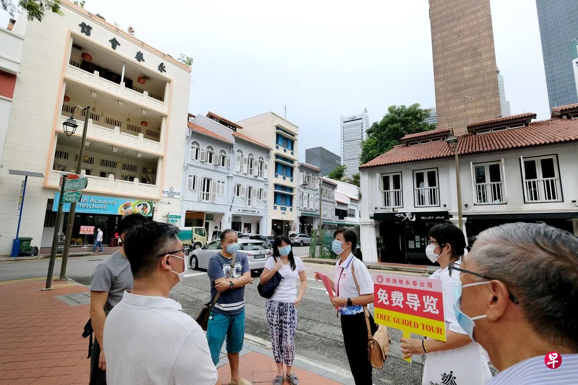 福建会馆家庭日与永春会馆导览 宣扬社群促进亲情订户赠阅文章配合福建会馆家庭日,永春会馆首办“直落亚逸的故事”免费导览活动,带领公众了解这一带的丰富历史。(龙国雄摄)陈爱薇 报道tangaw@sph.com.sg福建会馆家庭日以全新形式出击,在全岛34个地点设立游戏站点,开放给会员与家人组队参加,认识本地福建社群历史文化的同时,加强家庭凝聚力。新加坡福建会馆上一篇普救善堂拟打造文化馆 五年内办祖师金像出巡下一篇与团共聚购买此文章