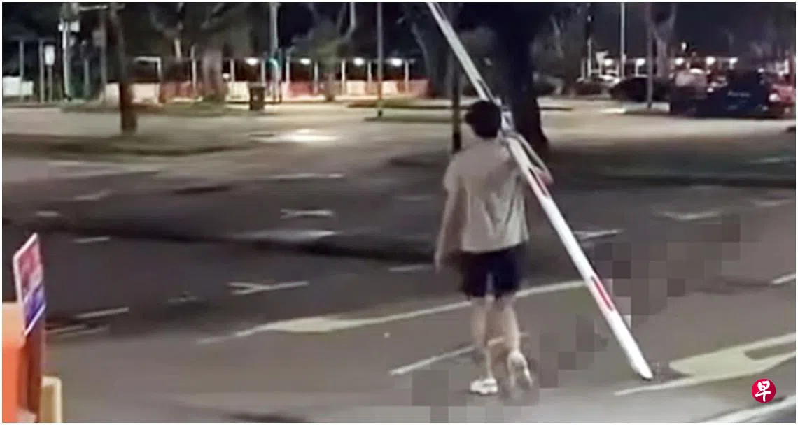 昨日(11月28日)面簿平台流传出一段源自社交媒体TikTok平台的短视频,一名身穿T恤短裤的青年将停车场闸门的栏杆拆下,过后还将栏杆扛在肩上,背对着镜头大摇大摆地离开。