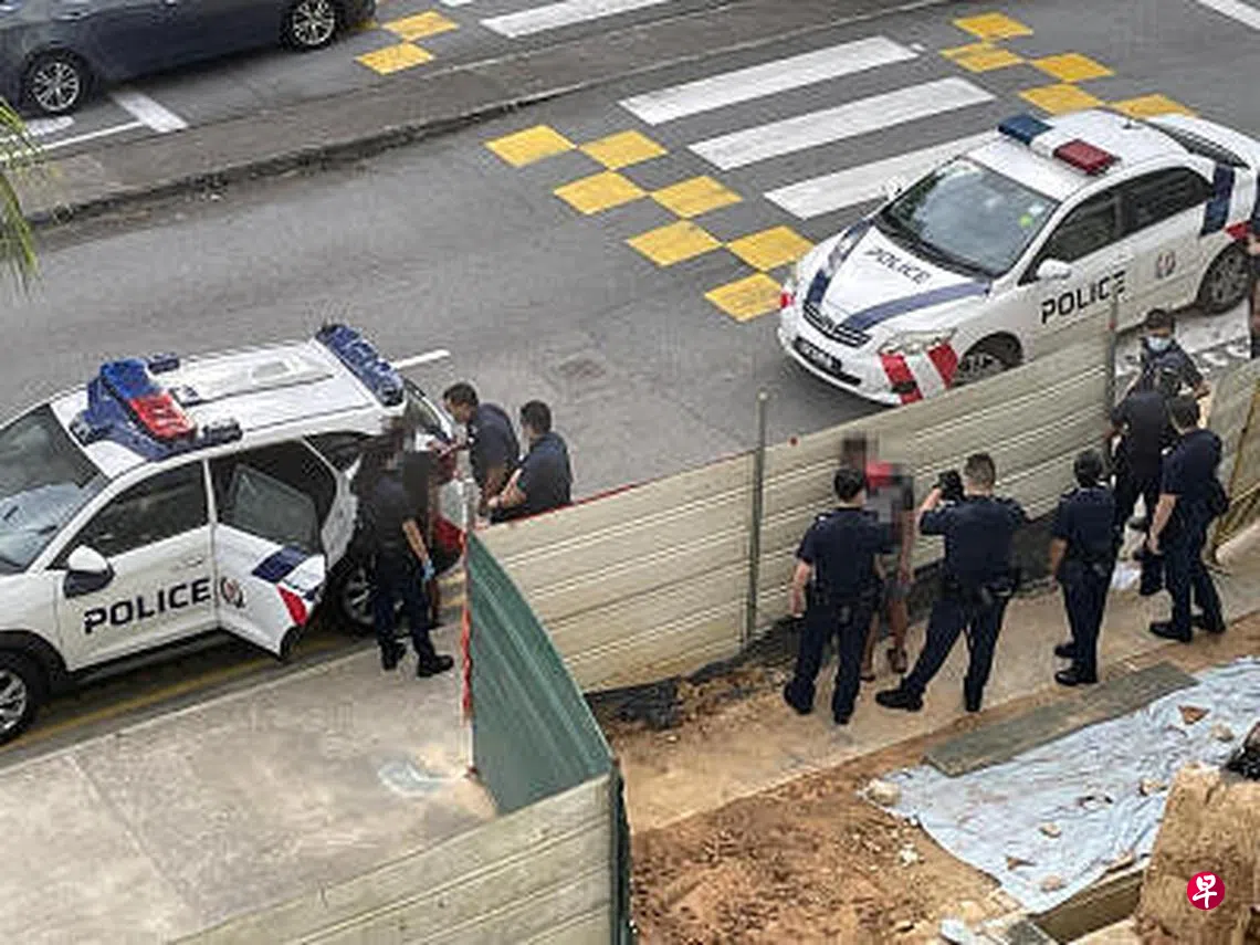 记者到达案发现场时,目睹少年被逮捕的一幕。现场来了六辆警车及10多名警员,在组屋楼下的建筑工地内向两名少年问话。
