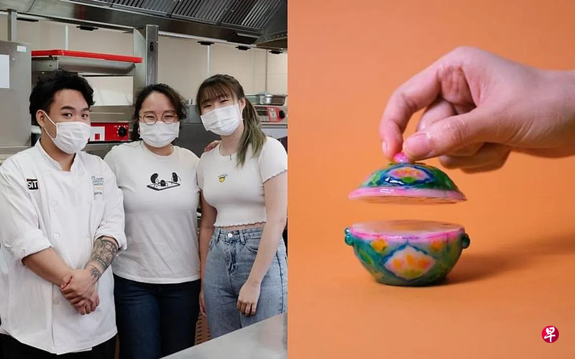 柯利颖(中)和罗悦瑄(右)并不是甜点制作的爱好者,而是新加坡国立大学工业设计(Industrial Design)学生。她们正在为一门食物设计学课程进行产品探索的研究。