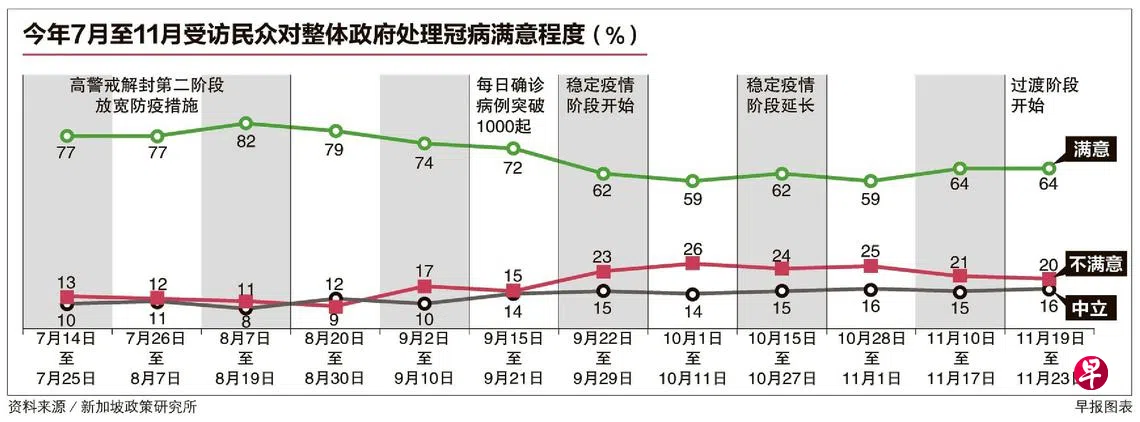 调查显示,民众对政府处理冠病的满意程度与确诊病例数目成反比,一旦病例上升,民众的满意程度就会下滑。民众对政府处理冠病的态度和看法,在9月至10月处于最低水平,当时社区病例节节攀升,并于9月21日首次突破千起。