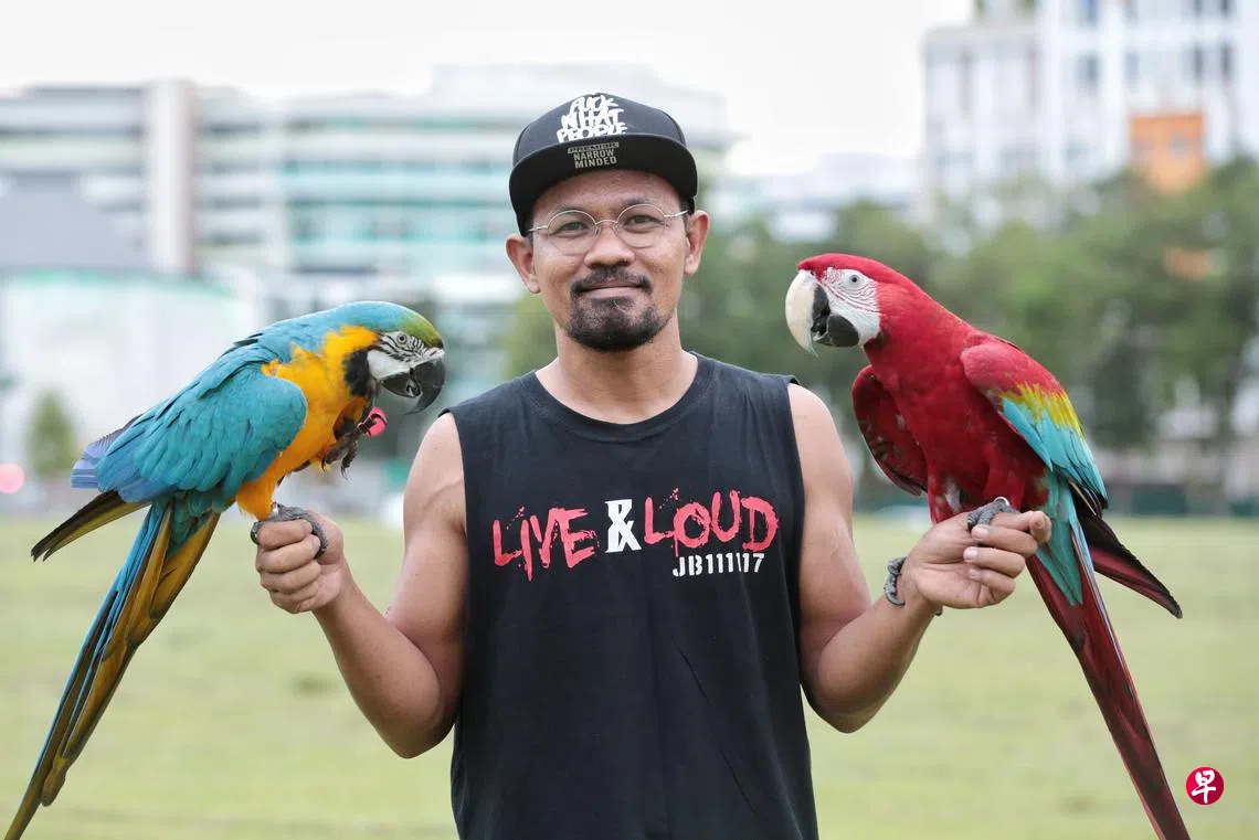 “狮城泰山”养金刚鹦鹉为乐,每周训练,还上网分享饲鸟经验。金刚鹦鹉寿命可达80岁,还有“身份证”。