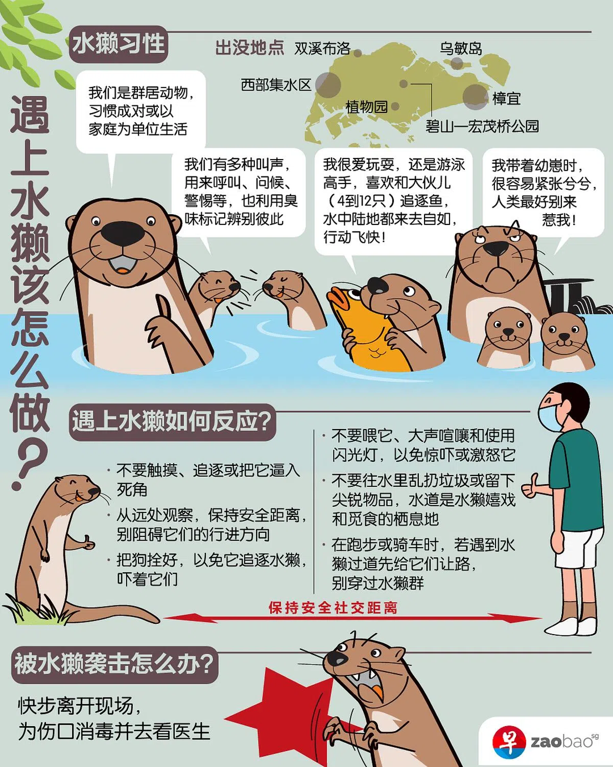 水獭平时可爱呆萌,颇讨人喜欢。不过它若感受到威胁,完全有可能“变脸”袭击人类。我们遇到水獭时该如何保护自己?zaobao.sg用一张图来教你!