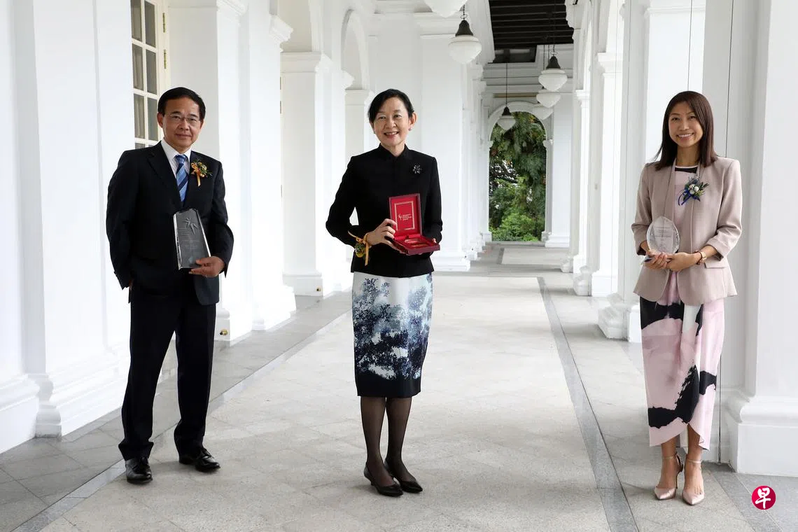 从儿科医生到新保总裁 40年奉献公共医疗 黄瑞莲获总统科学与科技奖奖章订户赠阅文章总统科学与科技奖昨天举办颁奖礼。新加坡保健服务集团总裁黄瑞莲教授(中)凭借出色的领导能力荣获科学与科技奖章,权威传染病专家王林发教授(左)以杰出的科研贡献获得总统科学奖,而专攻神经科学的罗欣薇博士则是青年科学家奖得主。(邝启聪摄)总统科学与科技奖是本地科研界的最高荣誉,今年由学术界、研究界和行业专家遴选出五名得奖者。本届得主横跨医疗和儿童早期发展研究、传染病、先进材料和癌症诊断等领域,他们昨天从哈莉玛总统手中接获奖项。尹云芳 报道wunyf@sph.com.sg传染病上一篇一病房护士过世 中央医院表哀悼并吁公众勿做揣测下一篇N水准会考成绩 下周五放榜购买此文章