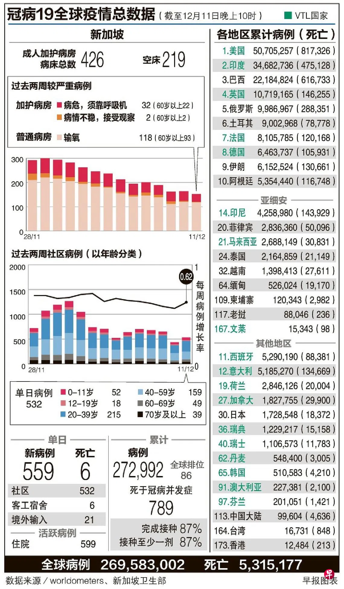 本地新增559病例 六人病逝订户赠阅文章许翔宇 hsiangyu@sph.com.sg我国昨天新增559起冠病确诊病例,六人因冠病并发症逝世。根据卫生部网站昨晚的数据,新增病例中532起是社区病例,六起来自客工宿舍,其余21起从境外输入。本地疫情上一篇本报调查:返校上课较安全 近半数家长将让孩子接种下一篇国大两机构要招募460名儿童 研究接种疫苗免疫反应购买此文章