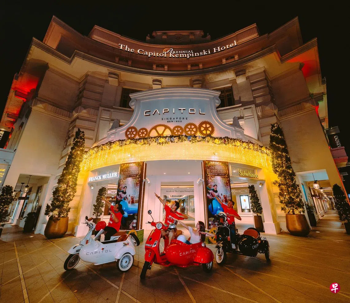 佳节脚步声近,从即日至本月26日,首都新加坡(Capitol Singapore)及赞美广场(Chijmes)邀请公众一起踏上“奇幻圣诞之旅”。除了热闹的圣诞市集、巨型歌唱圣诞树、溜冰场、人造飘雪,以及灯光投影秀,公众还能搭乘复古边车在市政区进行一场文化历史之旅。