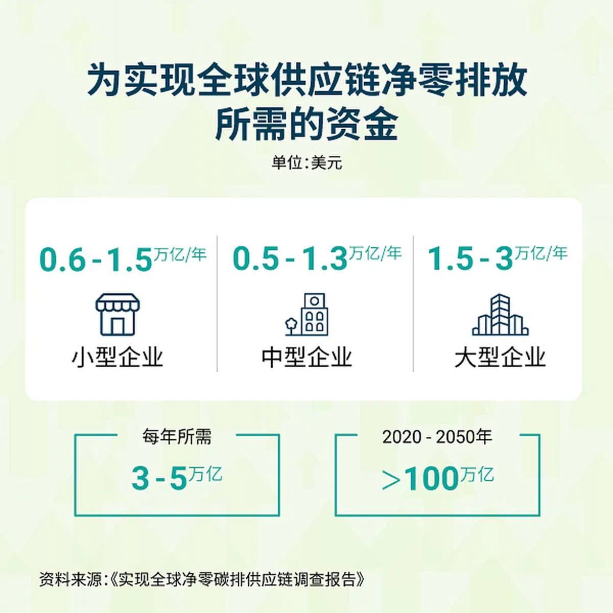 为了实现全球供应链净零排放,企业每年估计需投资3万亿到5万亿美元,2020年至2050年间投入的总资金超过100万亿美元。如果拖延投资,所需资金恐怕会更多,并加剧气候变化对供应链的冲击。