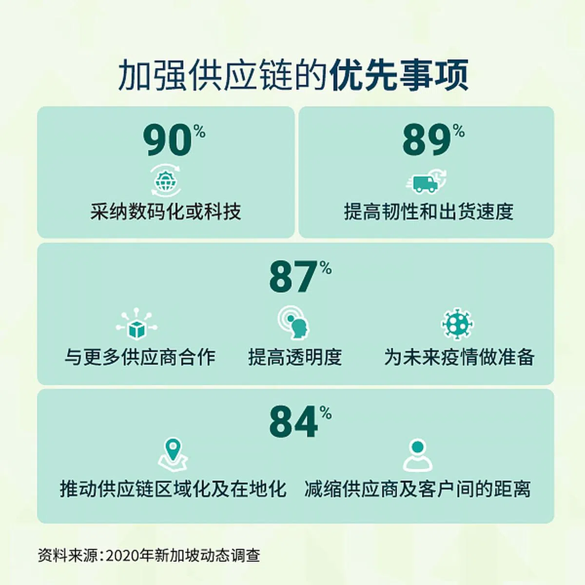 根据汇丰银行进行的2020年新加坡动态调查,多达52%受访企业认为重塑供应链将帮助他们减低成本。采纳数码化或科技、提高韧性和出货速度,以及与更多供应商合作,是它们加强供应链的当务之急。