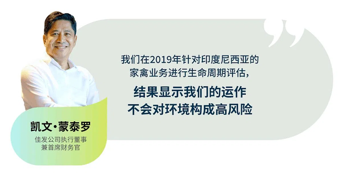 佳发公司执行董事兼首席财务官凯文·蒙泰罗(Kevin Monteiro)接受《联合早报》访问时透露,公司是首个在印尼正式进行这项评估的垂直整合家禽供应商,共花了两年时间完成。他说:“这项评估让我们更好地了解产品对环境产生的影响,结果显示我们的运作不会对环境构成高风险。”
