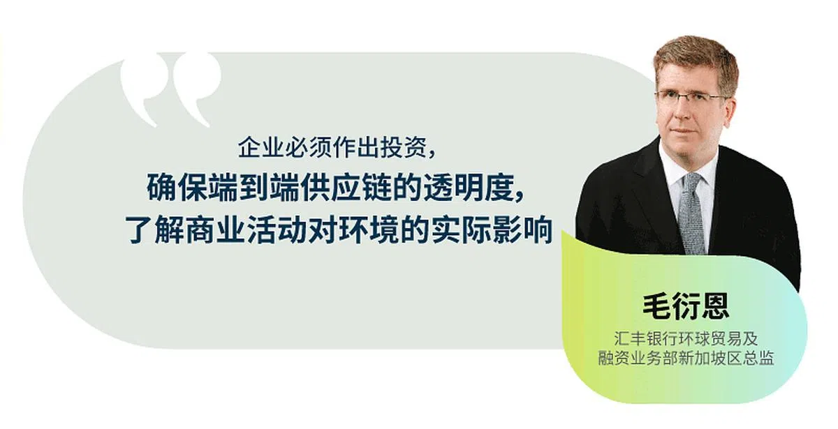 从上述可见,解决气候问题刻不容缓。汇丰银行环球贸易及融资业务部新加坡区总监毛衍恩(Iain Morrison)说:“供应链容易受气候变化冲击,例如严重风暴、水灾、干旱和火灾,这提醒我们急需要采取行动。企业必须作出投资,确保端到端供应链的透明度,以更好地了解商业活动对环境的实际影响,而运用科技正是关键。”