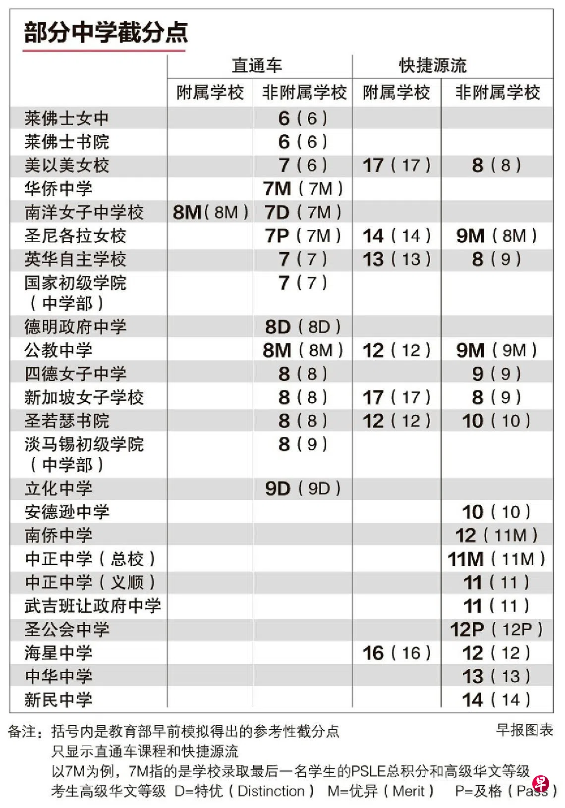 如同教育部早前模拟得出的参考性截分点,未有学校出现4分“完美成绩”的截分点。提供直通车课程的莱佛士女中和莱佛士书院截分点为6分,是入学门槛最高的。
