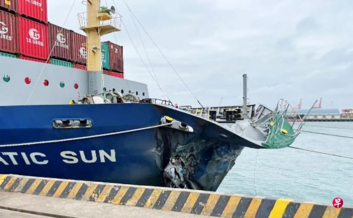 一艘新加坡注册的货船两天前在台中港码头发生意外,疑因受强风吹刮,船头猛撞码头而凹陷,所幸18名船员无人受伤。新加坡海事及港务管理局正在针对这起事故进行调查。