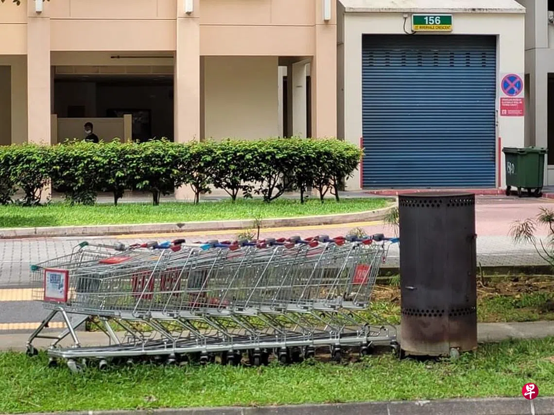 把超市手推车当成自家推车,直接推到组屋旁排排放!盛港社区数十辆手推车被居民遗弃路边,形成另类奇景。
