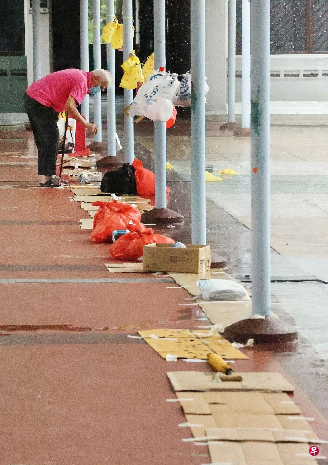 《新明》记者前一天到场时,发现有盖走道处,早已遍地都是纸皮、塑料袋、绳子、水瓶、篮子竹竿等物品。