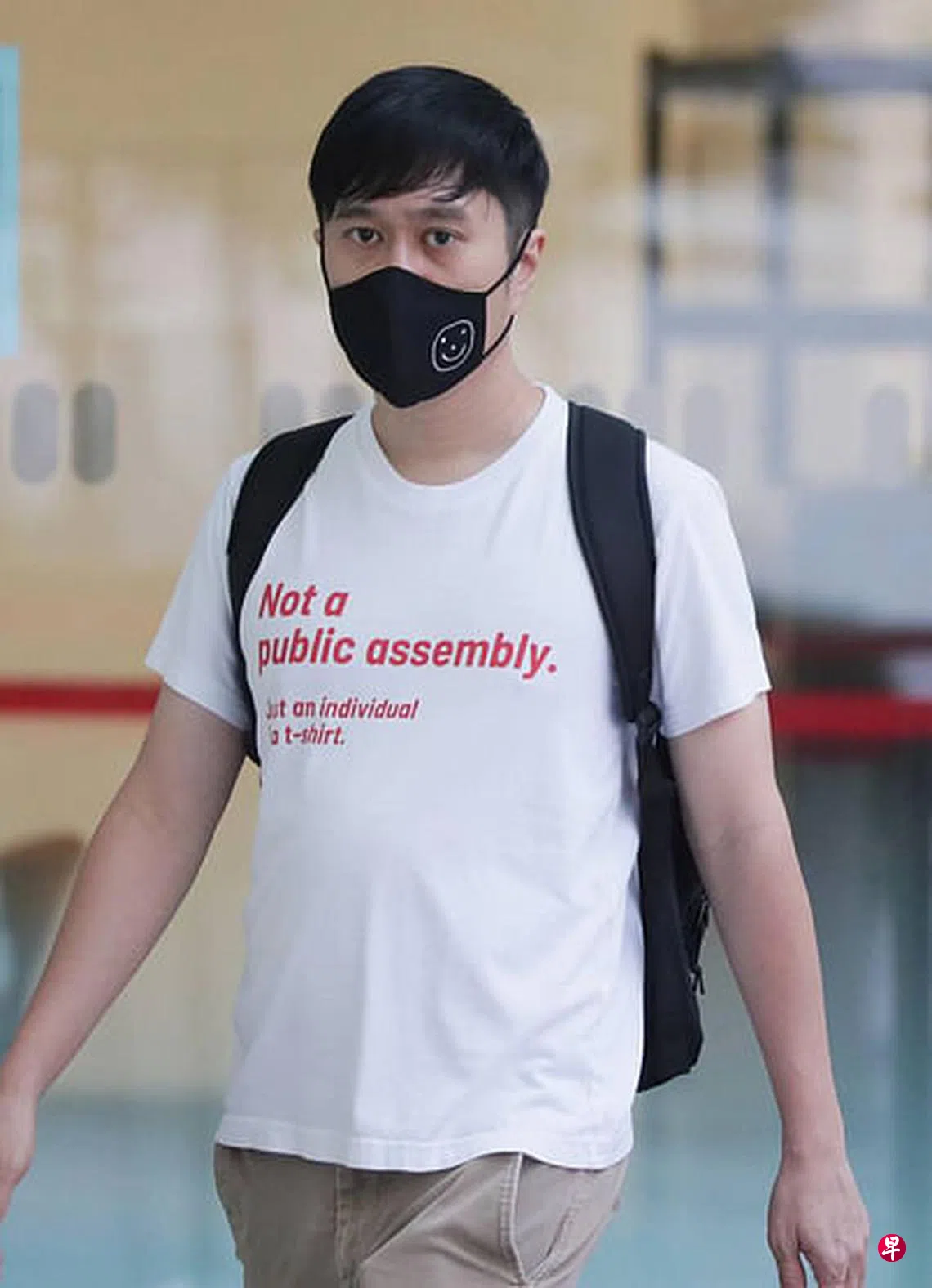 社运分子范国瀚举着一张纸在国家法院旧址外抗议,他不承认在搞非法集会,称自己只是拿着纸张拍照几秒钟不算集会,但他的说辞被法官否定,昨天被判罪成。