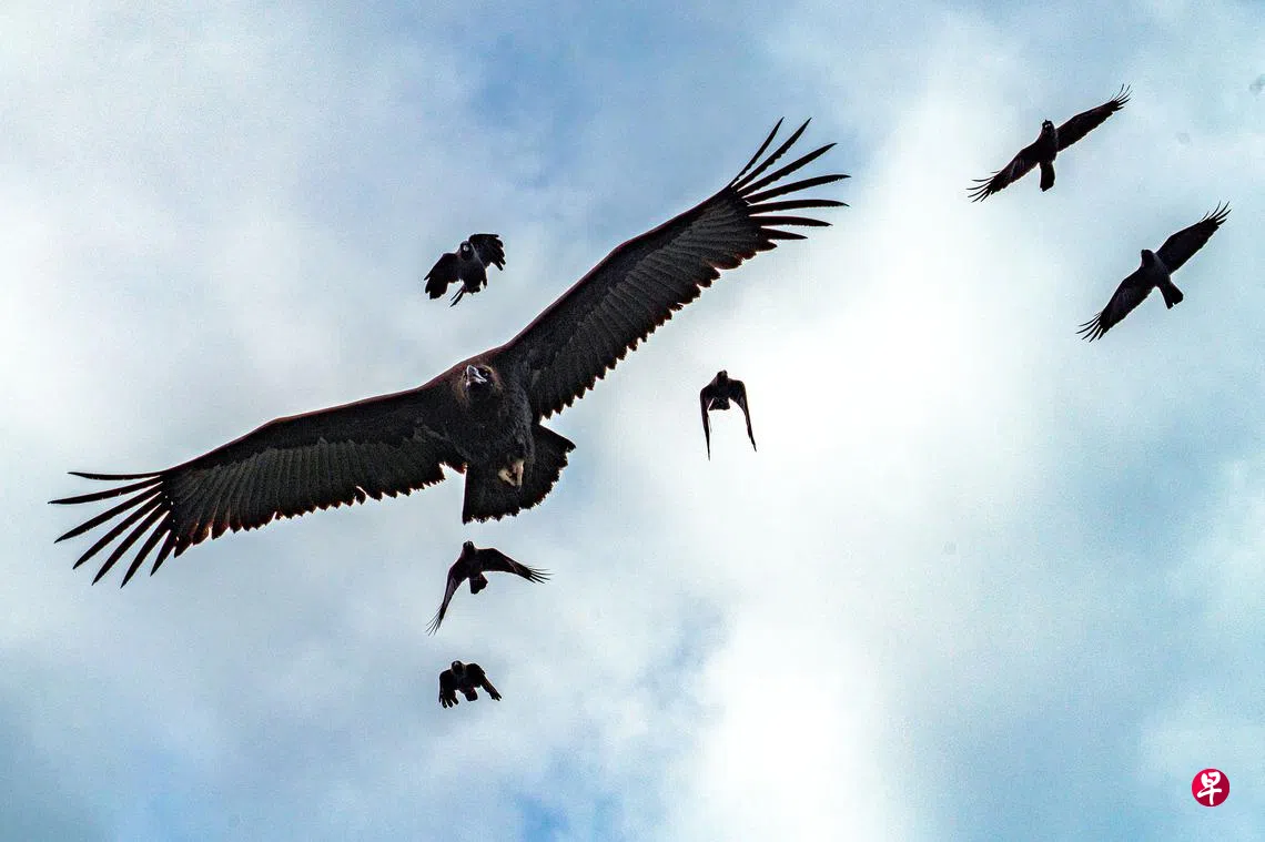 然而,秃鹫的起飞过程也并非一帆风顺,它起飞不久闯入乌鸦群中,乌鸦群起驱赶。体型巨大的秃鹫,空中与乌鸦群斗的一幕,也被《联合早报》摄影记者捕捉下来。