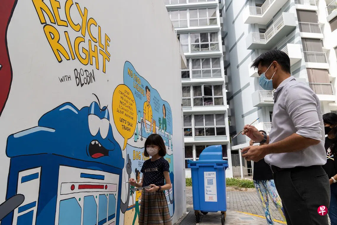 接下来,公众会在组屋区的垃圾槽和回收槽看到印有Bloobin的贴纸,提醒大家丢东西前,检查到底是垃圾还是可回收物。
