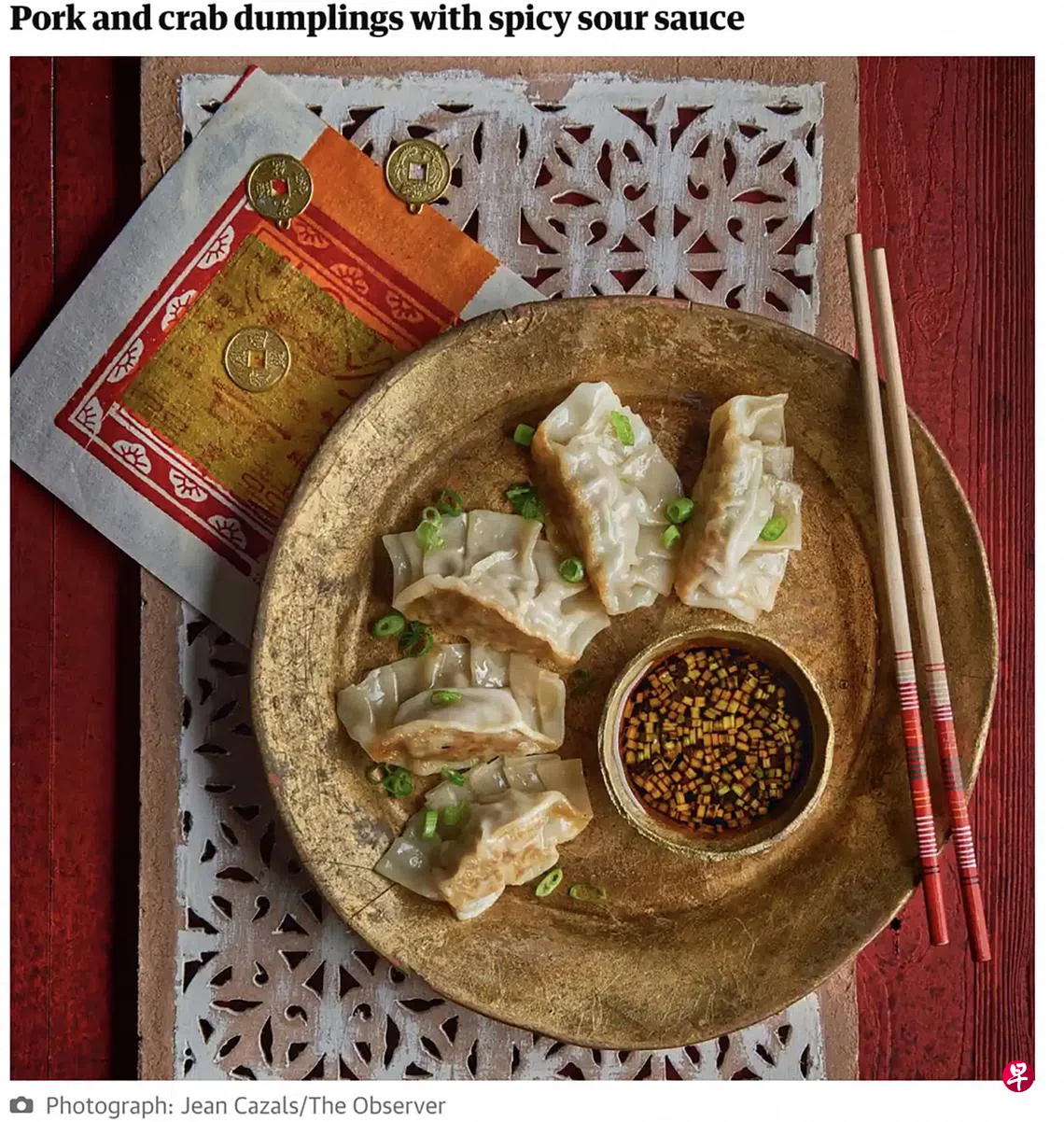 近日,英国媒体《卫报》撰文介绍农历新年美食“猪肉蟹肉饺配酸辣酱”时,在简介中写道:“饺子形状像金元宝,是新年的传统食品。”不过,该美食的配图却让人觉得诧异。