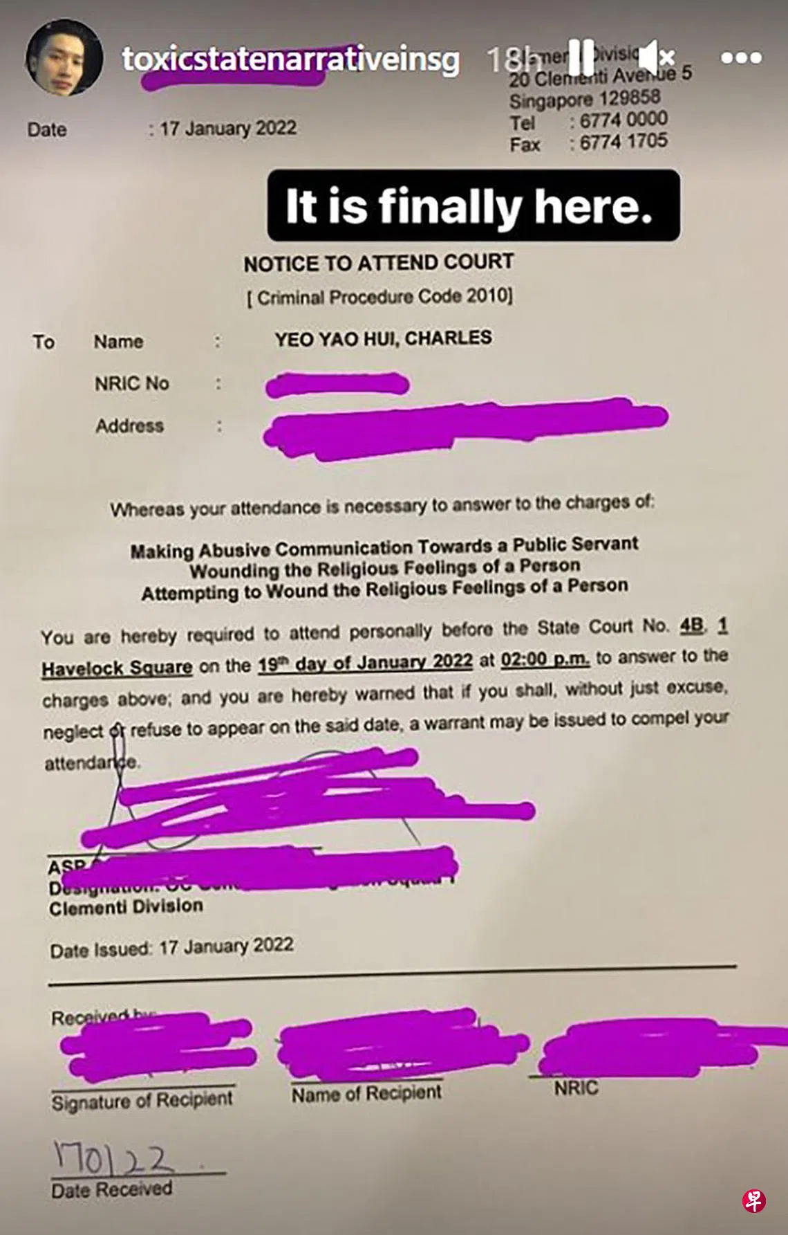 尽管警方没有公开这名男子的身份,革新党前主席杨耀辉同一晚在个人Instagram限时动态上,展示了一张要求他于1月19日下午2时出庭的文件,被控罪状与警方文告公布的一致,并透露自己将被控六项控状。杨耀辉目前也是31岁。