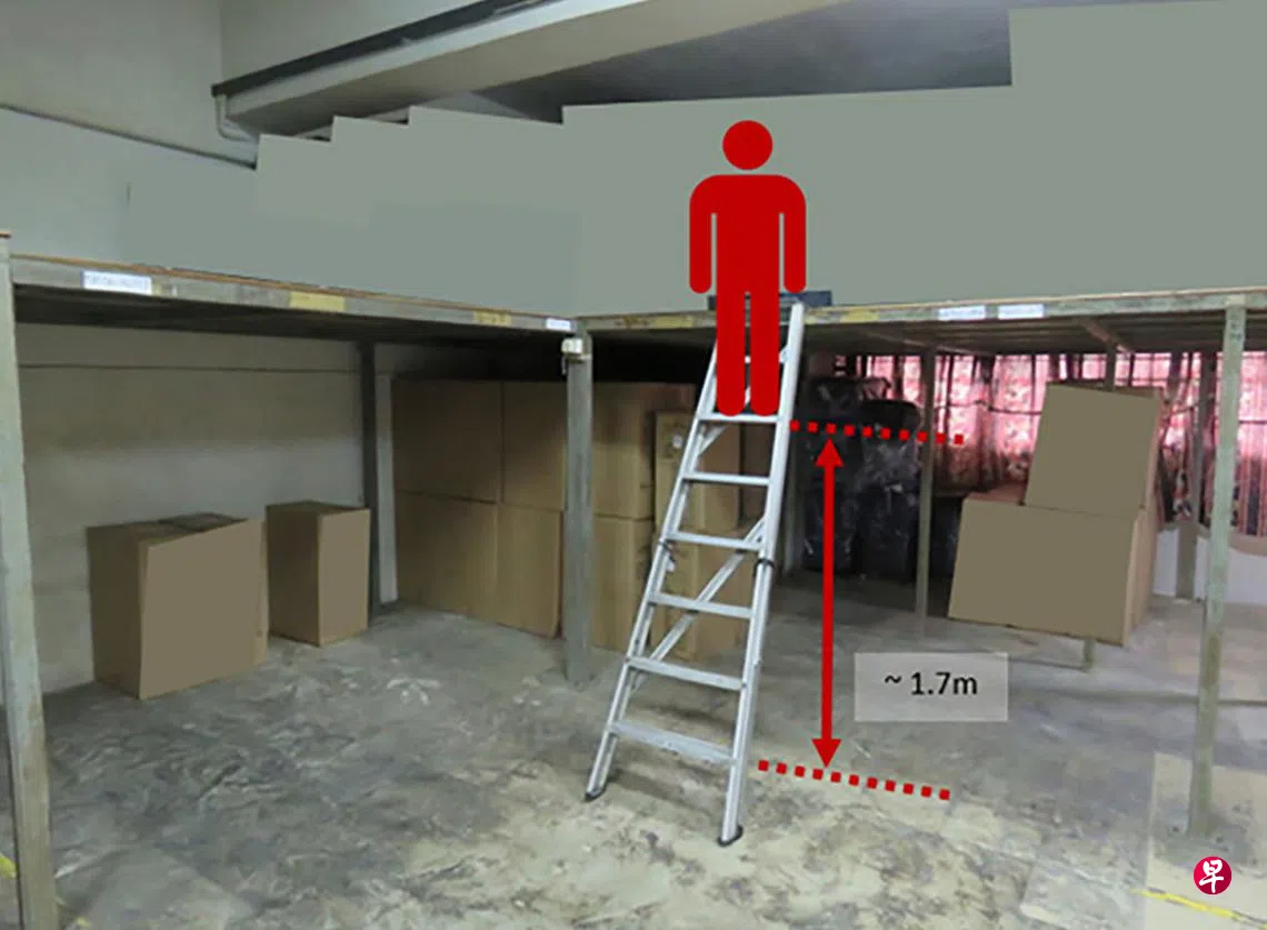 这起事故发生在去年12月24日,地点是在义顺工业园A第1024座大楼内。一名59岁的新加坡籍员工当时正爬下斜靠在夹楼(mezzanine)一把A型梯子,梯子突然滑动导致男子跌下,头部着地。他立即被送往邱德拔医院,并在12月27日伤重不治。