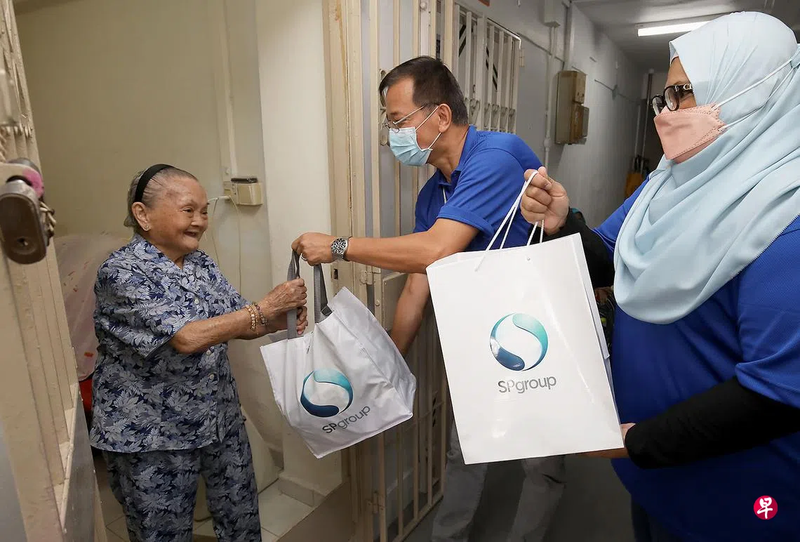 昨天下午1时许,独自住在芽笼峇鲁一房式租赁组屋的陈秀芳(93岁)从来自新加坡能源集团的义工手中接过两袋礼包,里面装有米、食品罐头、搓手液,以及口罩等物品。