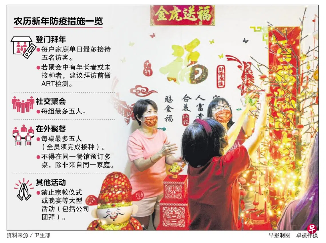 为了谨慎起见,农历新年期间的社交聚会人数限制维持不变,每户家庭每天最多接待五名访客。卫生部建议公众去拜年前,先做抗原快速检测,以保护他人。