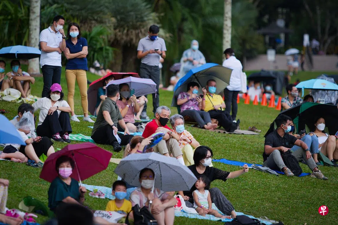 昨天傍晚下着零星小雨,不过身穿红色上衣的李总理和夫人并未打伞,他们在人群中席地而坐,感受新春的气息。两人也遵守防疫措施的要求,与其他观众保持至少一米的距离,并全程佩戴口罩。