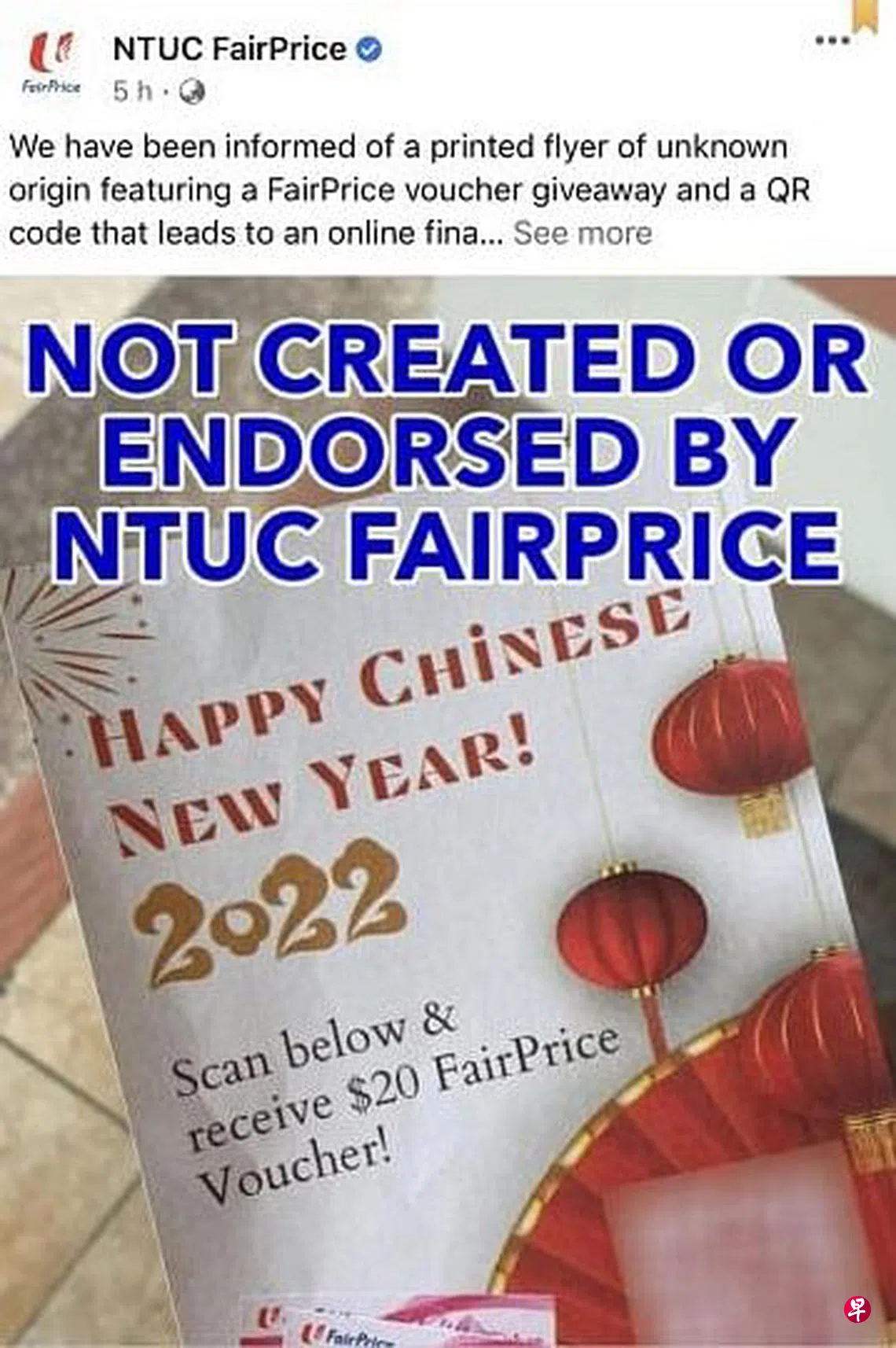 扫描传单上的QR码后,填写个人资料参加财务规划的问卷调查,就能获取20元“NTUC”超市礼券?但职总平价超市说,宣传单与NTUC毫无关系。