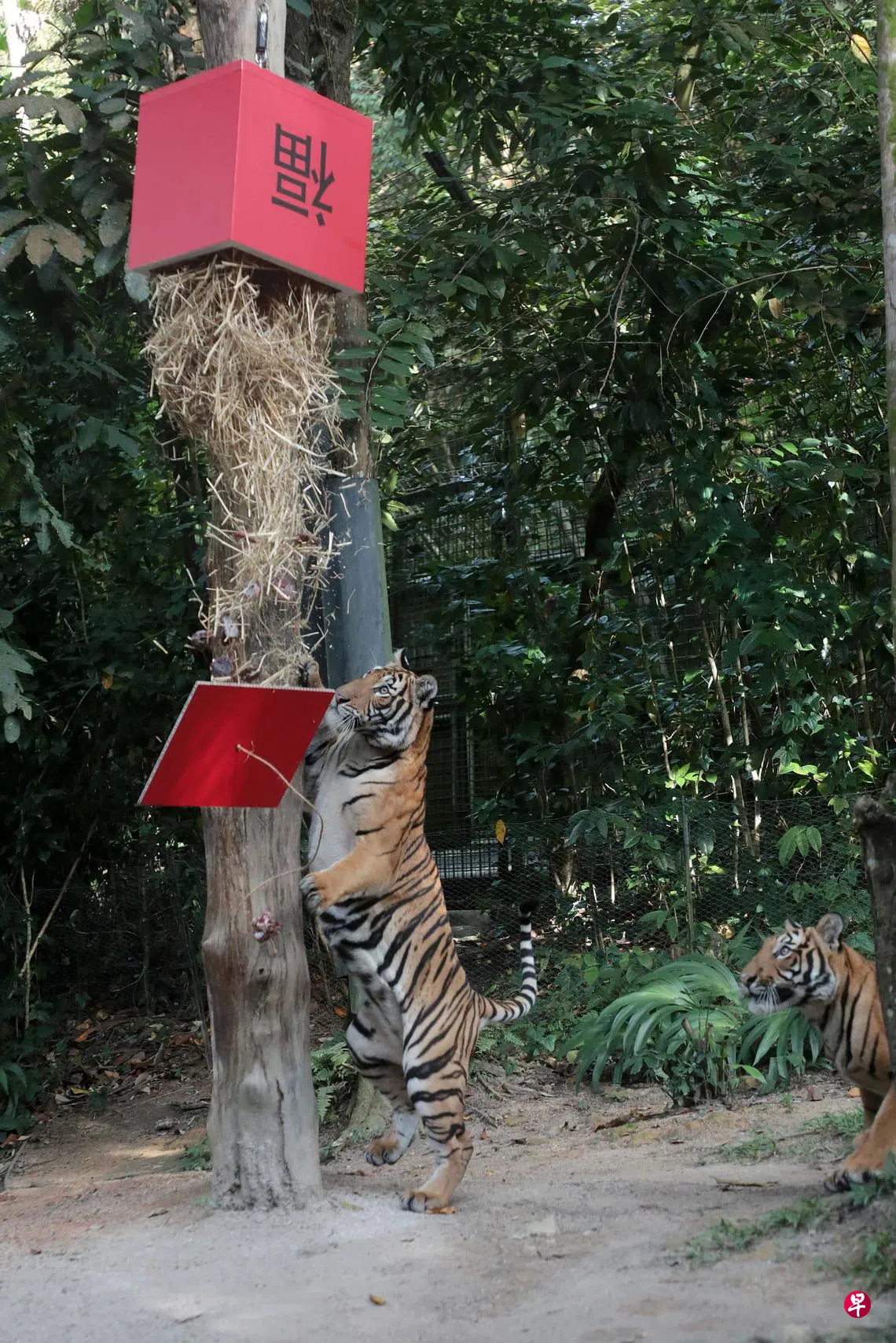 来临农历新年,夜间野生动物园1岁多的双胞胎马来亚虎Arhaa(左)和Sali(右),将与母亲Intan凭借狩猎技能,从特制皮纳塔(Pinata,盛放玩具与糖果的容器)和福盒中,寻获零食。动物园威猛的10岁马来亚虎Sulong则会从形如炮竹的容器中享用肉类大餐。
