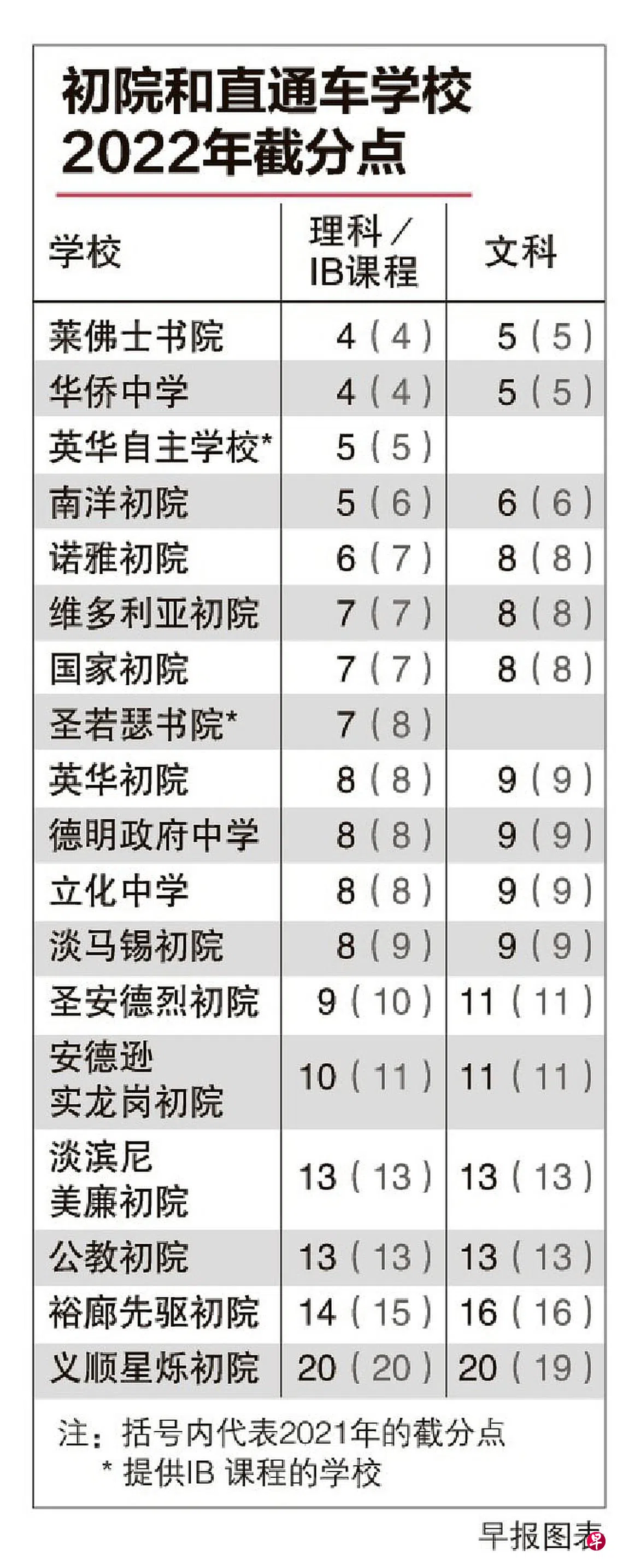 初级学院和直通车学校的联合招生活动结果昨天公布,各校的截分点大致上与去年相同。几所学校的理科班截分点减一分,意味入学门槛比去年略高。