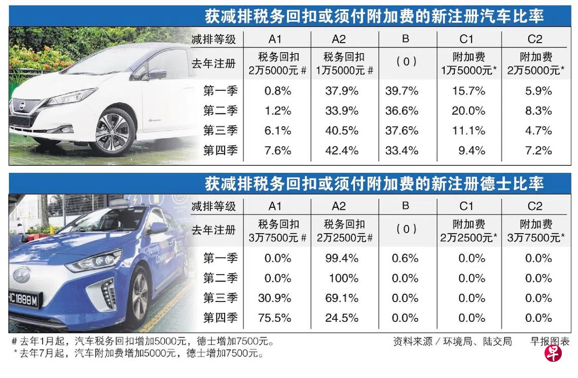 环境局和陆交局指出,去年有更多新注册的中小型汽车(A组)和大型及豪华车(B组)享有税务回扣,获最高2万5000元回扣(A1级)的新车比例,从第一季的0.8%增加到第四季的7.6%。这些车款都是电动车。
