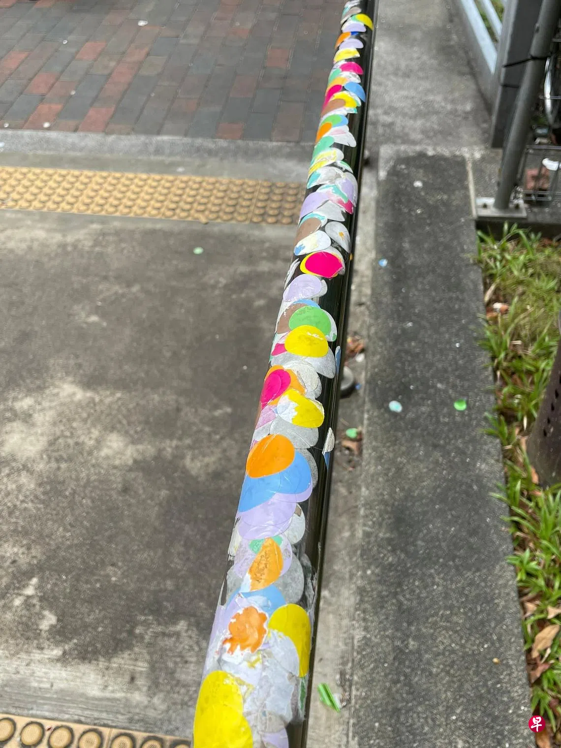 为了管控疫情,各大医院、综合诊疗所、小贩中心、食阁等等在进口处分发颜色贴纸,让通过检查的公众贴在身上以便识别。一些公众离开之后,不找地方丢弃贴纸而随手转贴到其他地方,导致一些建筑外墙、厕所、电梯、栏杆、德士站或巴士站等,处处有五颜六色的贴纸,有碍观瞻,也造成了社会负担。