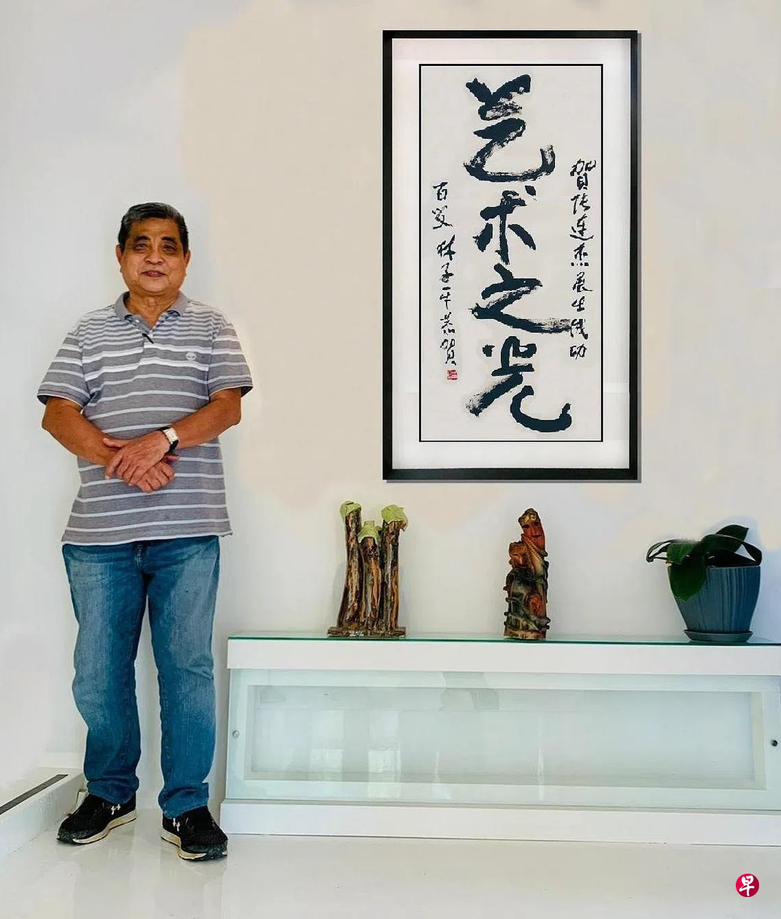 张连杰感激艺术界朋友对他办个展所给予的鼓励。文化奖得主林子平为祝贺他展出成功,赠送他一幅字,写着“艺术之光”。张连杰也在展览中展示这幅字。
