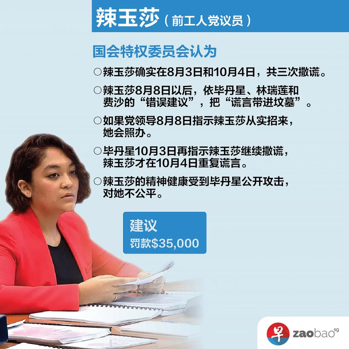 国会特权委员会建议对辣玉莎第一和第二次在国会撒谎,分别罚款2万5000元和1万元,共计3万5000元。