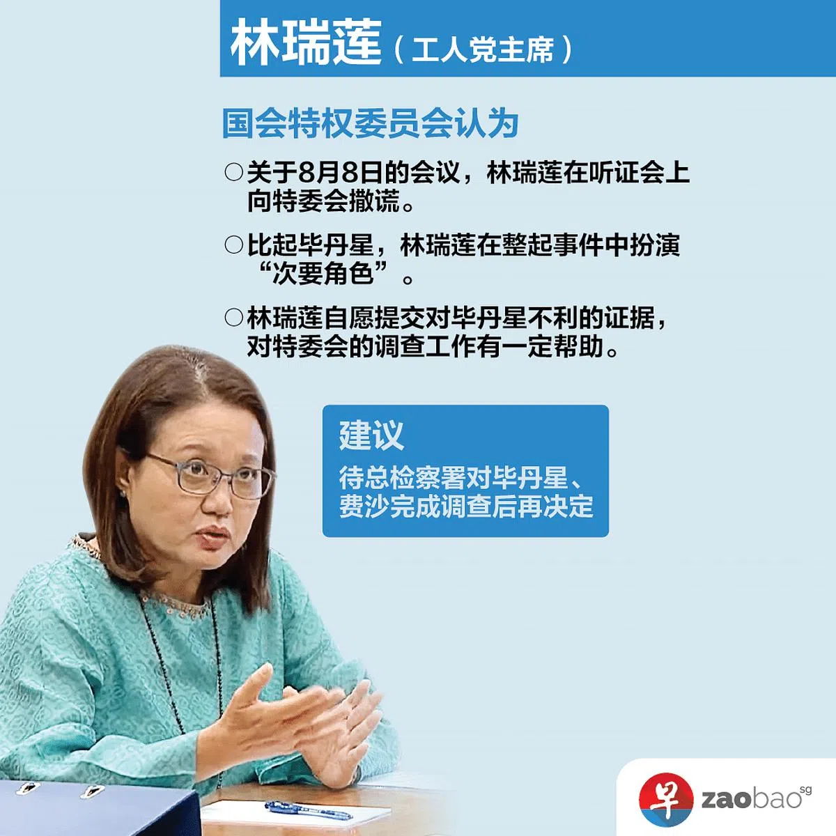 国会特权委员会认为,毕丹星在引导辣玉莎撒谎方面起到了关键和主导的作用,并且是辣玉莎10月4日在国会上再度撒谎的“关键推动者”(Key Orchestrator)。林瑞莲和费沙只是扮演“次要角色”。