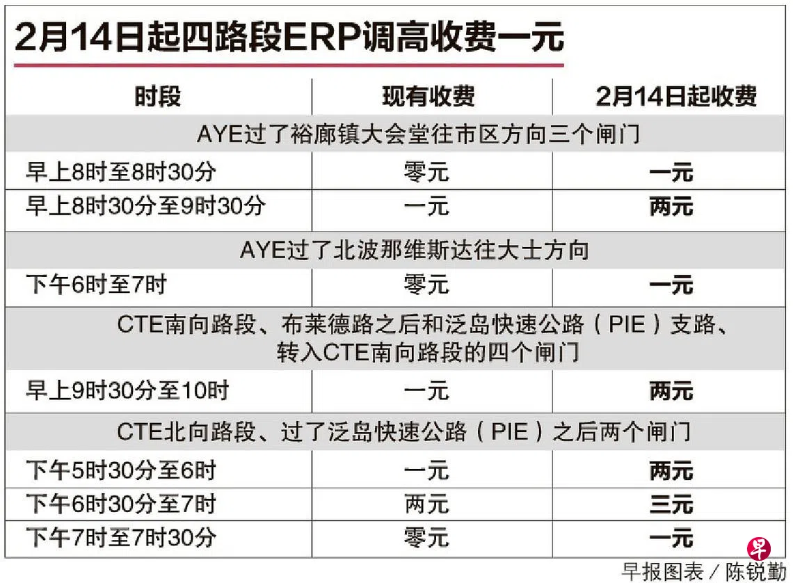 部分快速公路的车流量增加,造成一些路段拥堵,从下个星期一(14日)起,四个地点的公路电子收费(ERP)闸门将在特定时段调高收费一元。