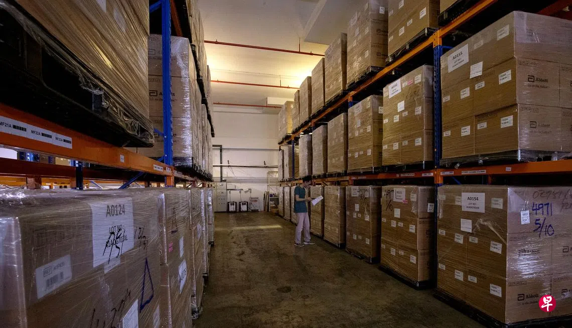 走进雅培(Abbott)分销商设在金文泰的仓库,只见货架上摆满了一箱箱冠病自助检测仪,都是准备送往药房、派发机和电商平台的。