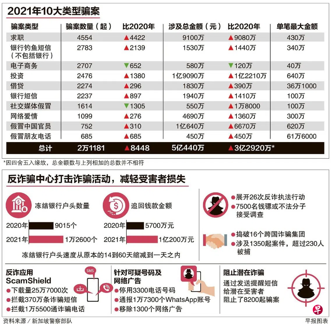 新加坡警察部队昨天(2月16日)发布2021年罪案数据,诈骗案大增导致罪案总数从2020年的3万7273起增至4万6196起,这其中有51.8%即2万3931起是诈骗案,骗走新加坡人至少6亿3300万元。