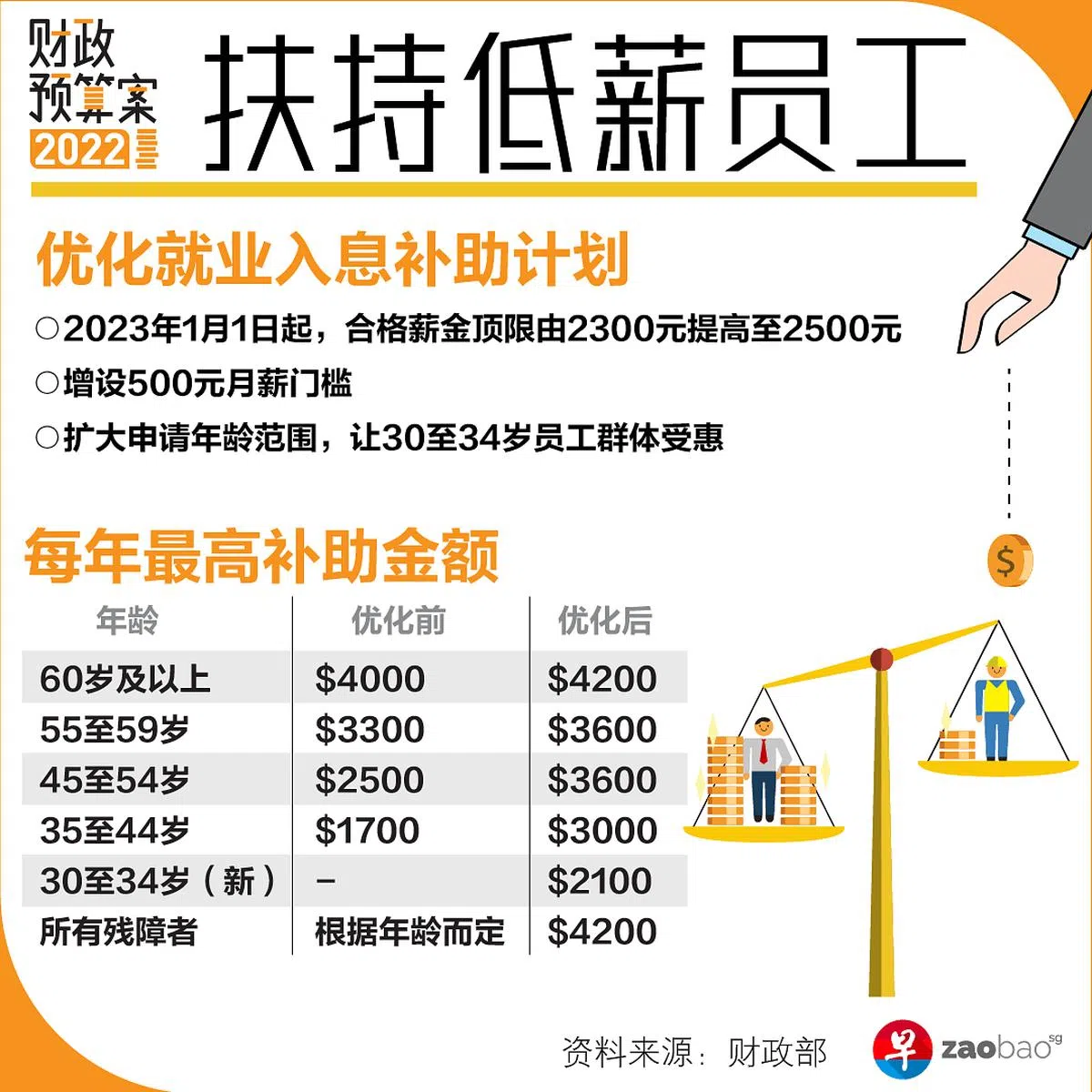 明年1月起,WIS的合格月入顶限将从2300元调高至2500元,并将低薪员工的受惠年龄进一步降低至30岁。