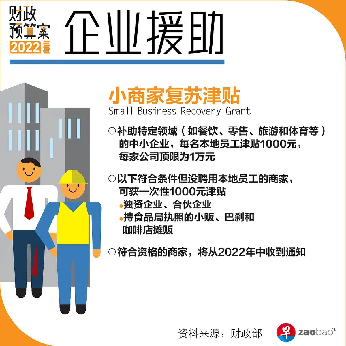 本地独资企业和合资企业,及没聘请本地员工,但持新加坡食品局执照的小贩、巴刹和咖啡店摊贩,同样可获得1000元。
