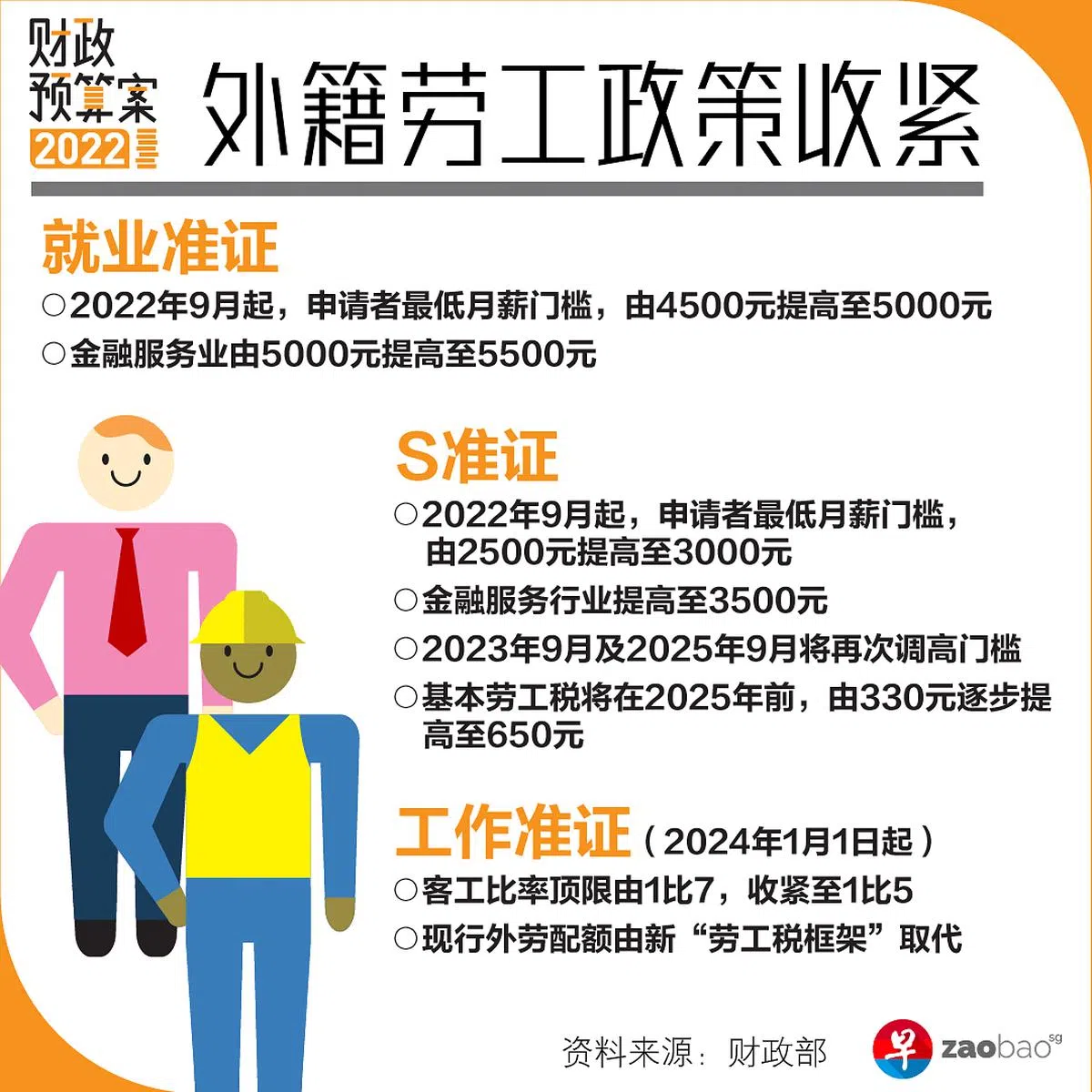 今年9月起,新就业准证申请者的最低月薪将从4500元提高到5000元,S准证的收入门槛也会从2500元调高到3000元;收入门槛较高的金融服务业,就业准证和S准证的最低月薪也各调高500元,到5500元和3500元。