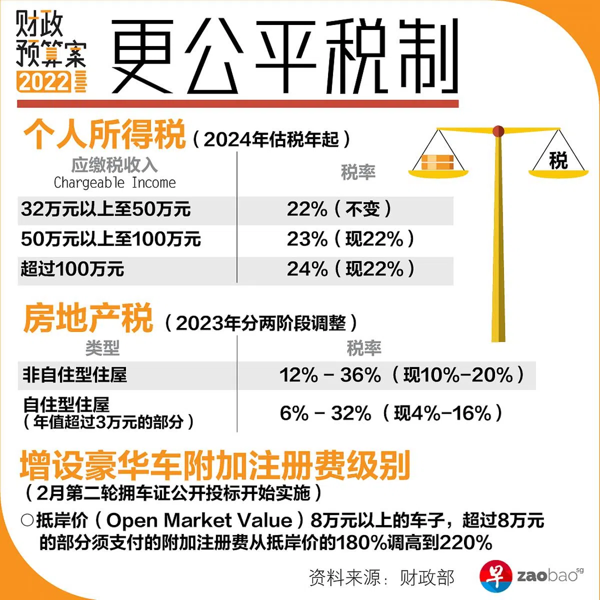 应缴税收入(chargeable income)从32万元以上至50万元,个人所得税边际税率保持在22%。应缴税收入50万元以上至100万元,边际税率将从目前的22%,调高至23%。至于应缴税收入100万元以上,边际税率从22%调高至24%。