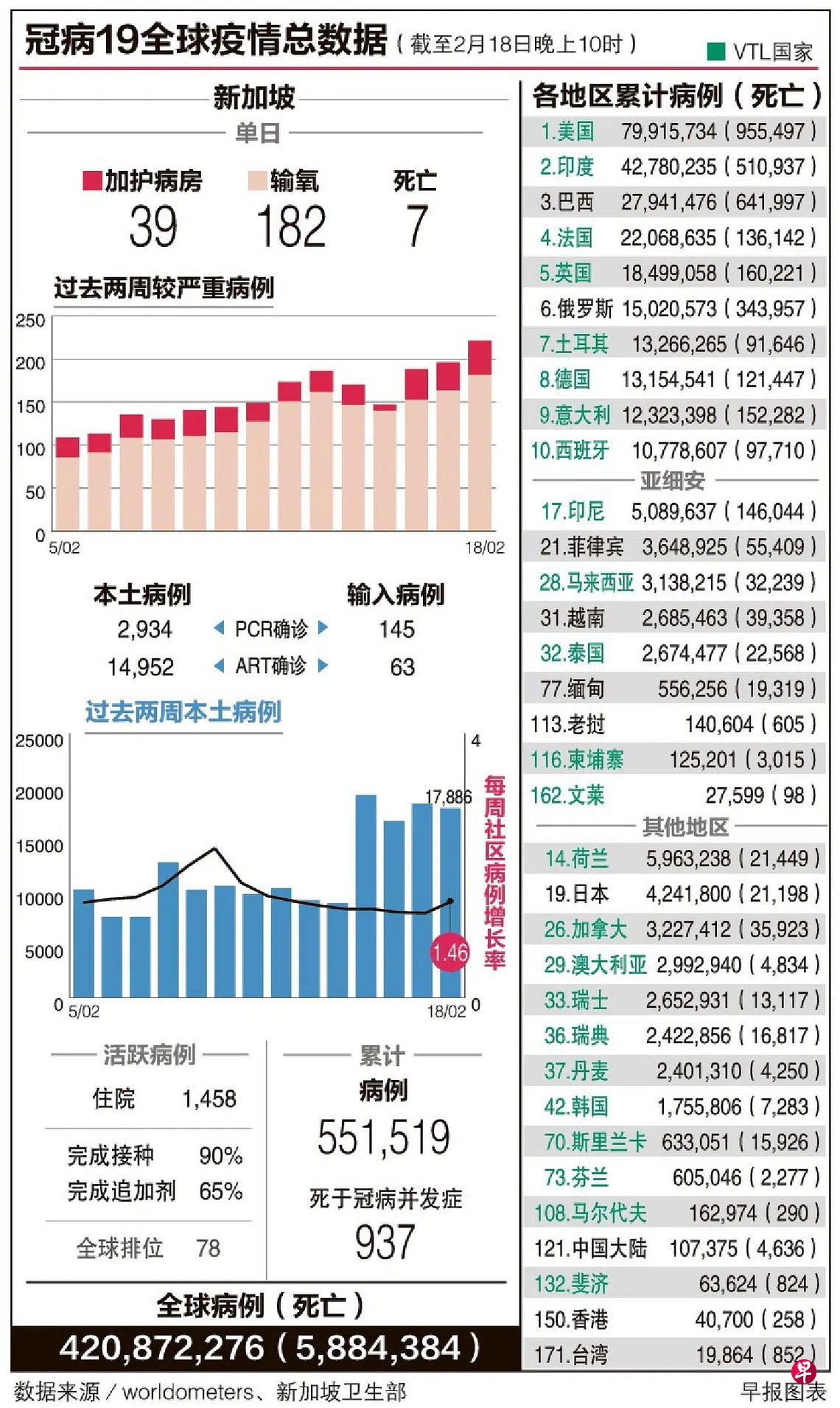 截至昨天中午,本地有1458名病患因冠病住院,比前天少了14人。需输氧的病患从164人增至182人,加护病房病患则从32人增至39人。