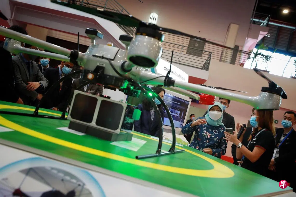 哈莉玛总统(右二)昨天上午走访新加坡航空展,参观新科工程馆,听取新科工程介绍去年推出的包裹递送无人机DrN-35LS等最新航空科技展品。